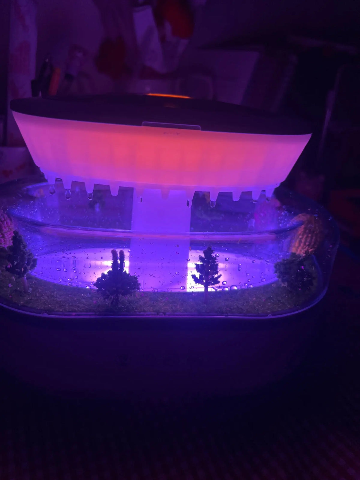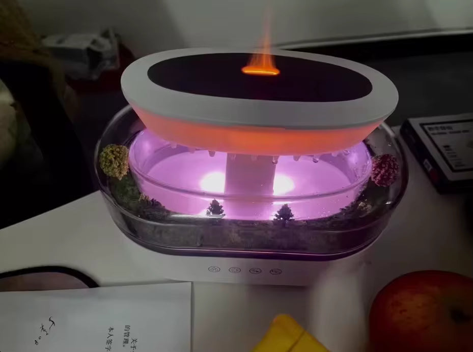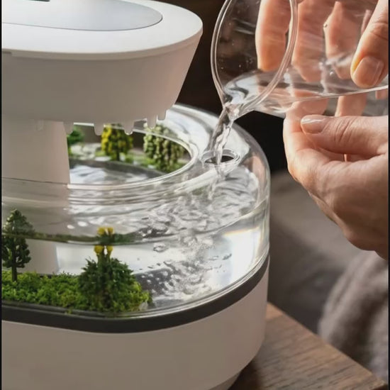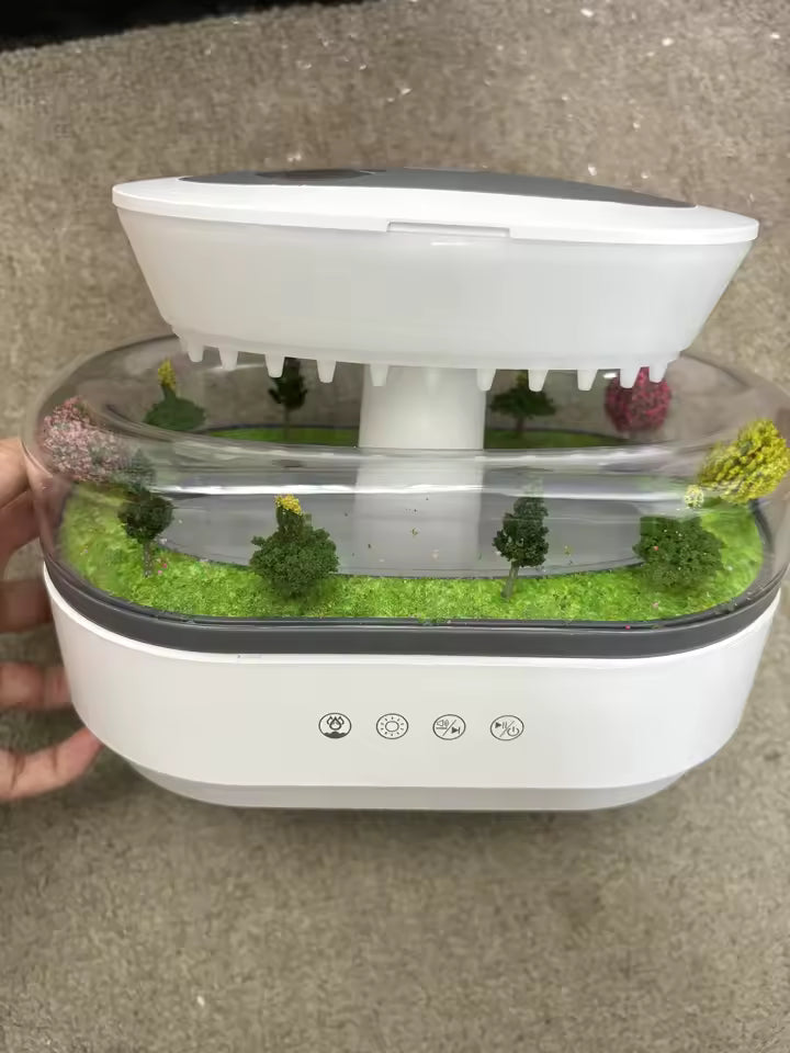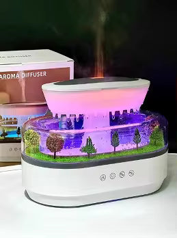 Su innovador diseño de micro-paisaje con efecto lluvia no solo humidifica, sino que crea una experiencia visual y sensorial única. Observa cómo las gotas simulan una suave lluvia mientras el vapor aromático llena tu espacio de bienestar.